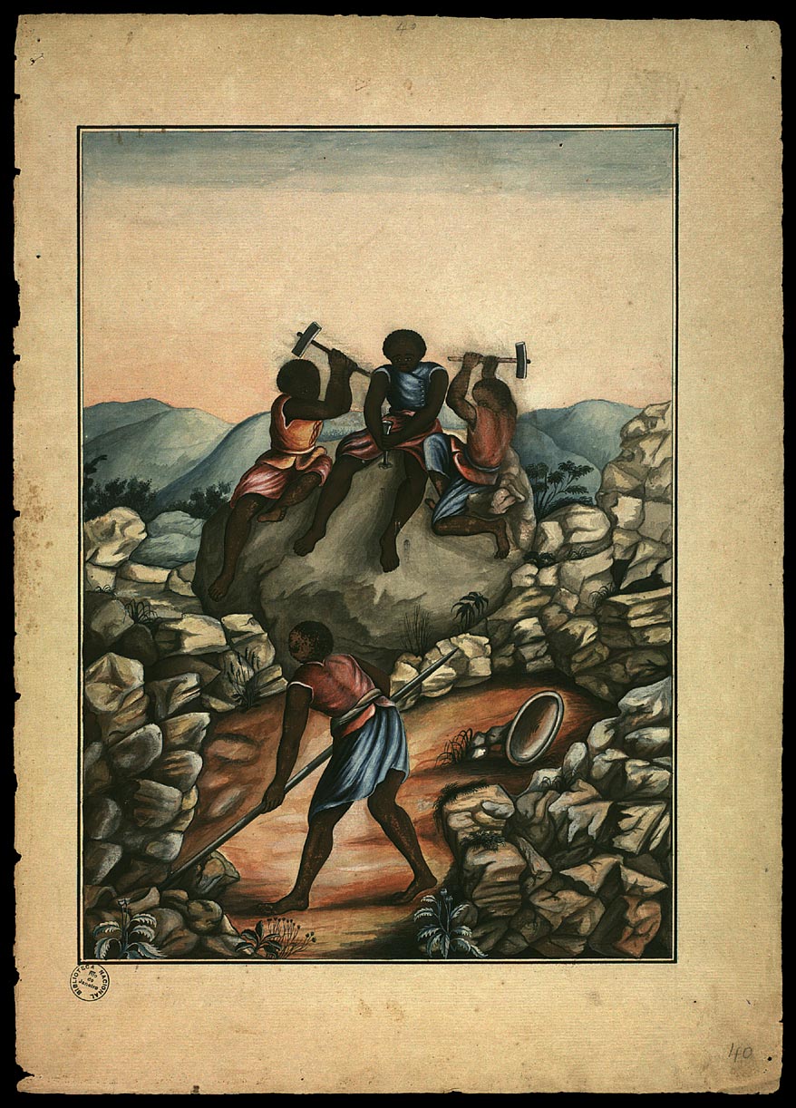 Escravos britadores. Carlos Juliao, Riscos illuminados de figurinhos de broncos e negros dos uzos do Rio de Janeiro e Serro do Frio (Rio de Janeiro, 1960).